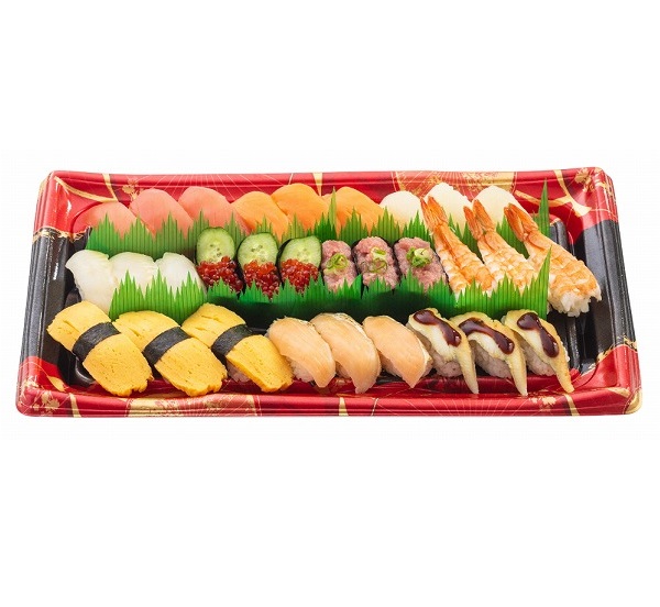 【商品内容】まぐろ、サーモン、いか、かれい、いくら軍艦、まぐろたたき軍艦、寿司えび、玉子、焼きサーモンハラス、煮穴子