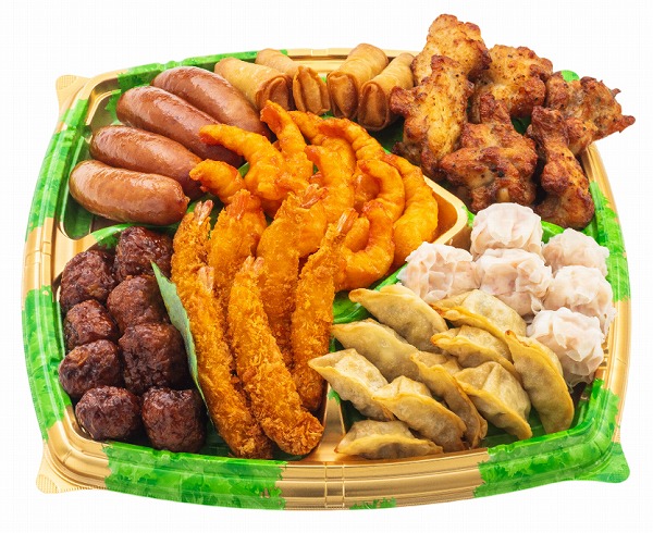 【商品内容】海老チリ、海老フライ、肉団子、ポークフランク、春巻、手羽元あぶり焼き、かに風味焼売、揚げ餃子