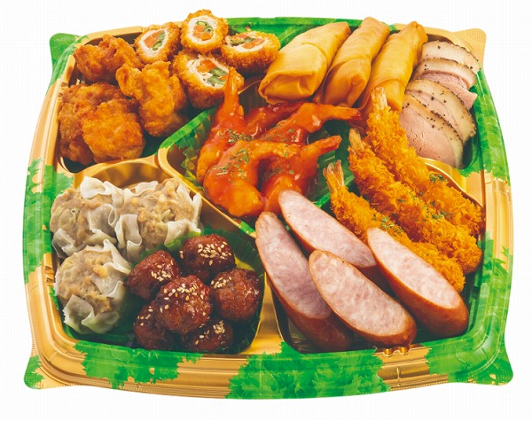 【商品内容】海老チリ、鶏唐揚げ、豚野菜巻きフライ、春巻、合鴨スライス、海老フライ、フランク、肉団子、焼売