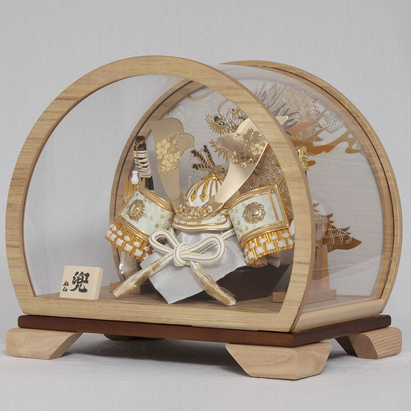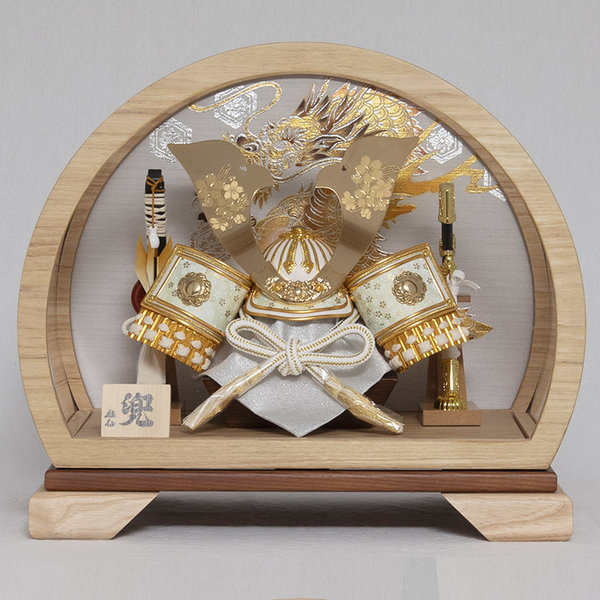 金色の大鍬形に桜をあしらった兜飾りです。背景には勇猛な龍を配しました。半円型の木目のアクリルケースです。