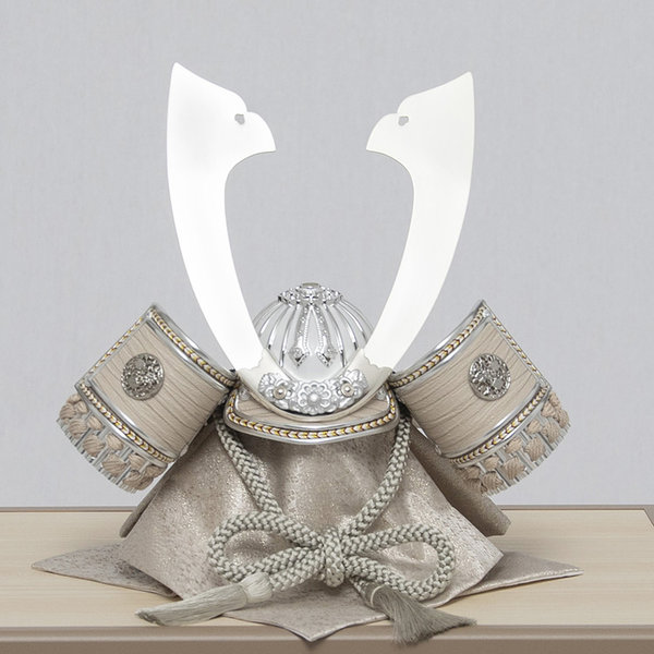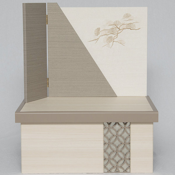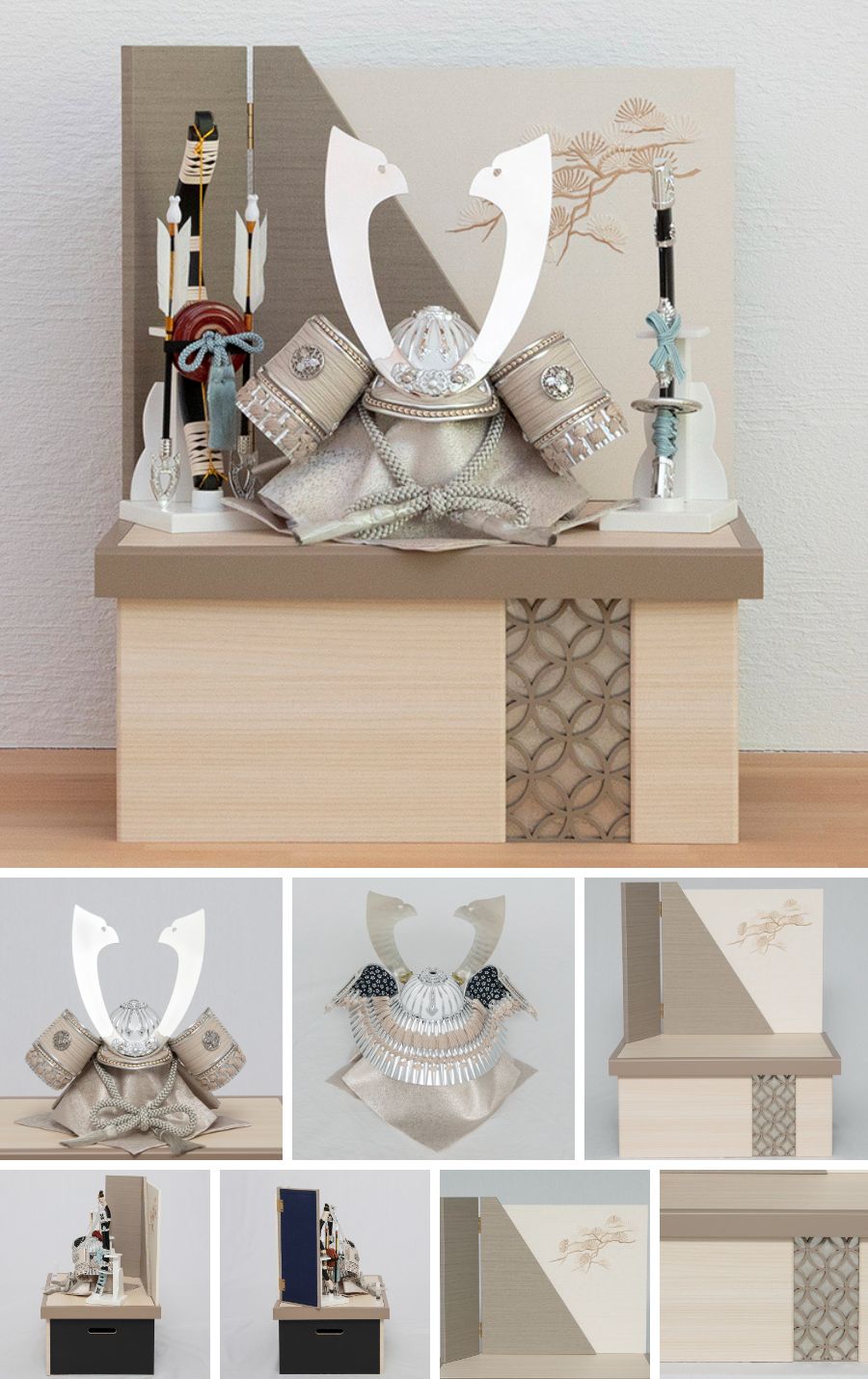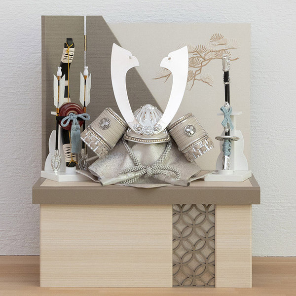 おしゃれなモカ色の台屏風に白銀色の兜を飾りました。幕板には吉祥文様の七宝を配し、屏風にはめでたい松の刺繍を施しました。