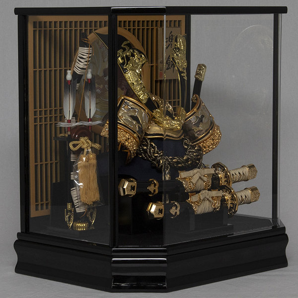 前飾りに魔除けの護身具といわれる太刀を二本配しました。金の格子飾りが兜を引き立てます。アクリルを使用した軽量の六角形のケース飾りです。