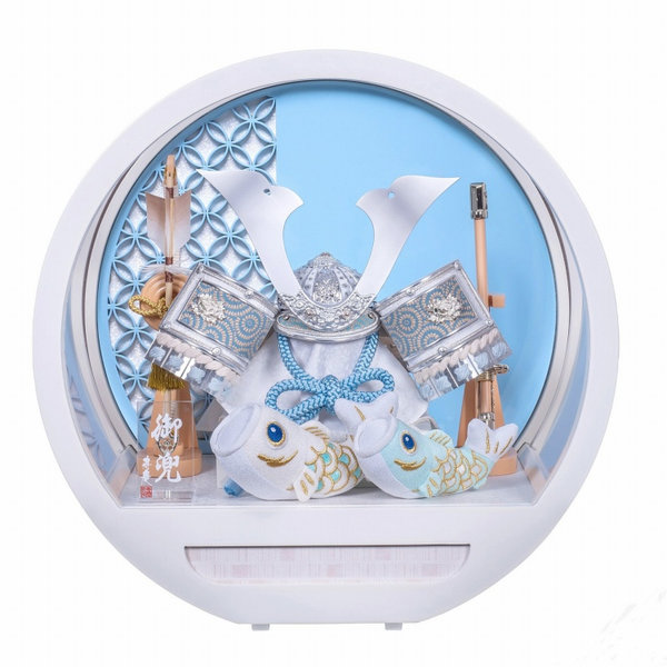 水色を基調としたシルバー色の鍬形兜に、前飾りにはちりめん生地の鯉のぼりを配しました。
