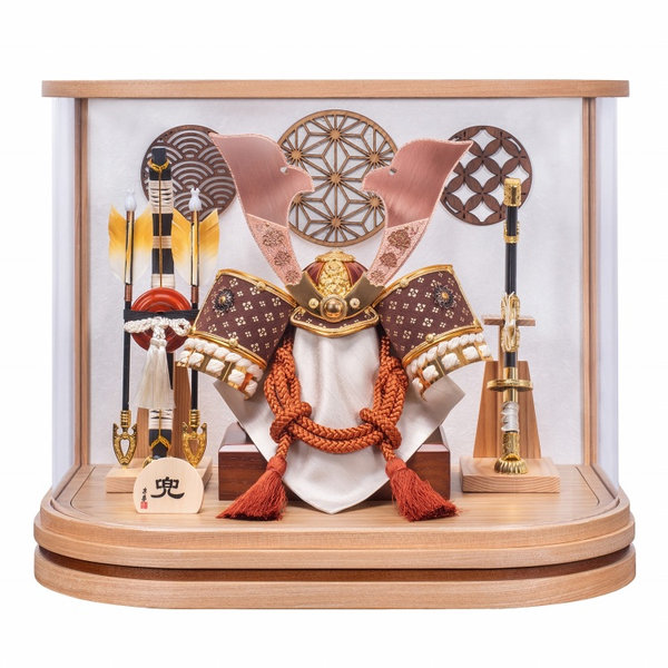 金彩吹き返しに牡丹柄二本鍬形の銅色兜です。背景に吉祥柄の格子細工を配した、ケース前面が丸みを帯びたお飾りです。