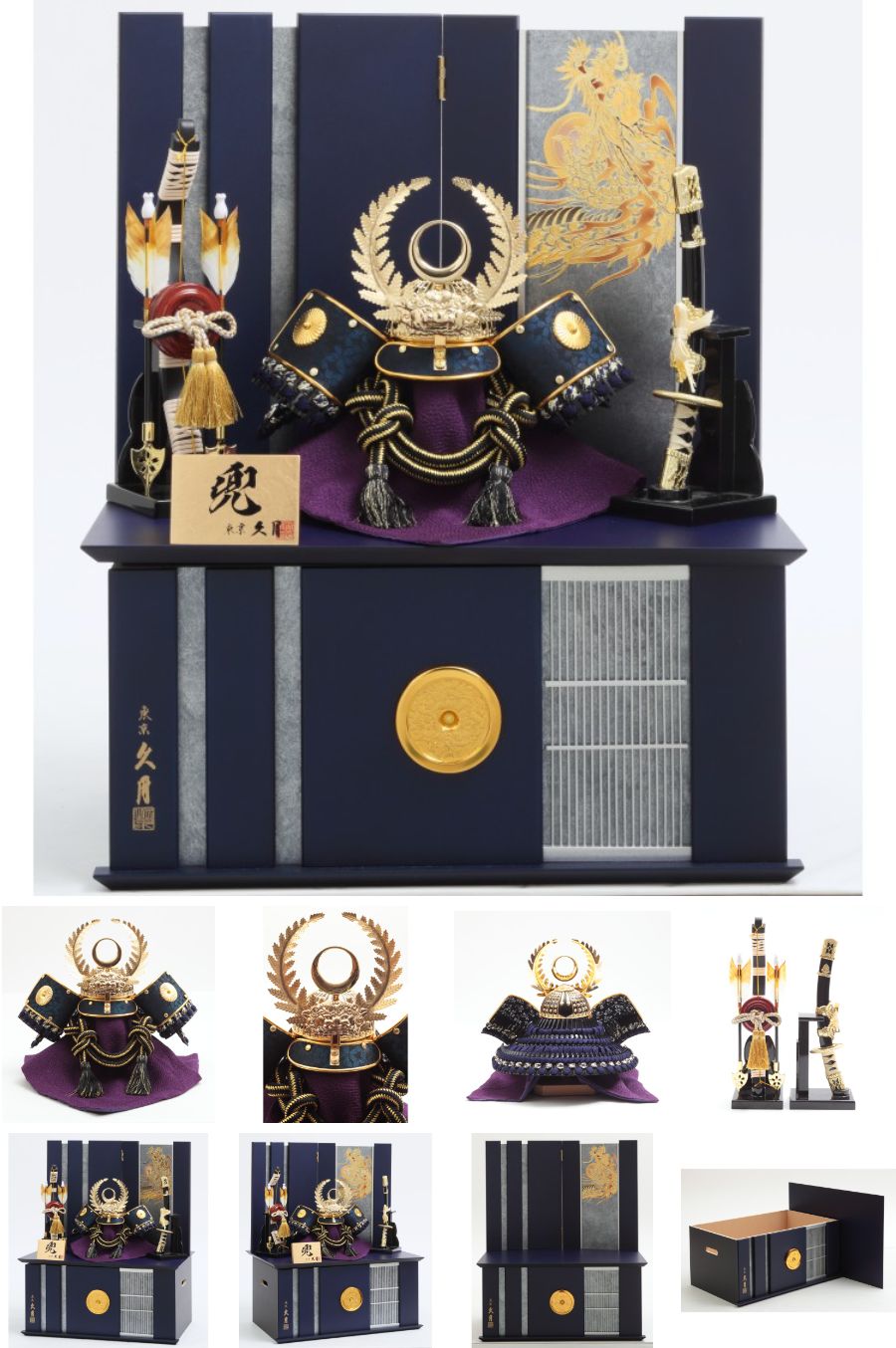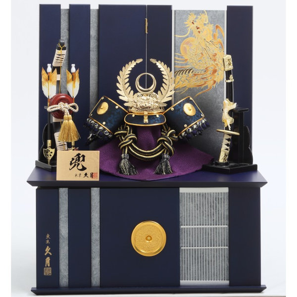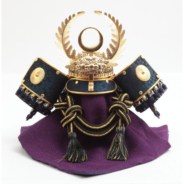 紺色の収納箱に徳川家康公をイメージした兜をセットしました。前立てに配されたシダの飾りは「長寿」や「子孫繁栄」の象徴とされています。