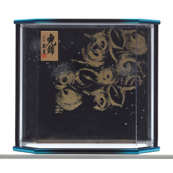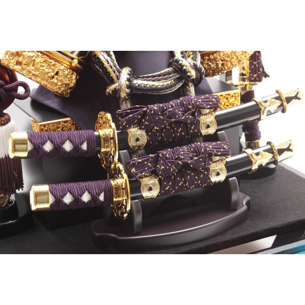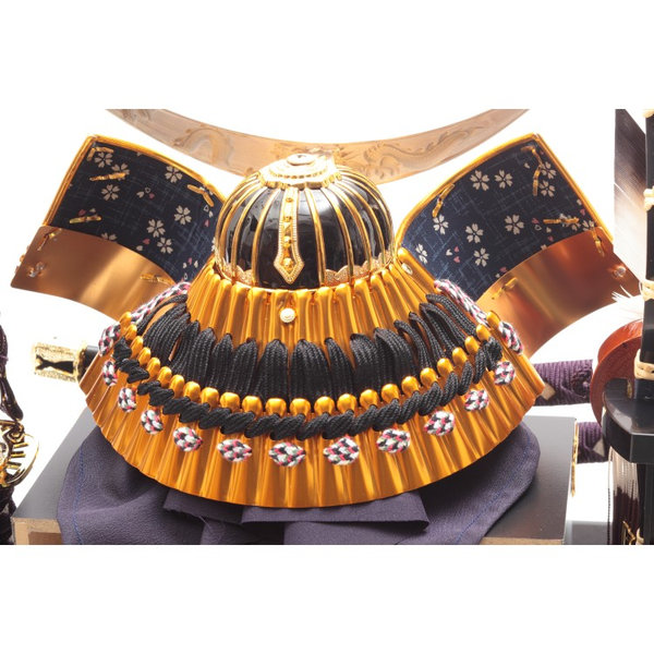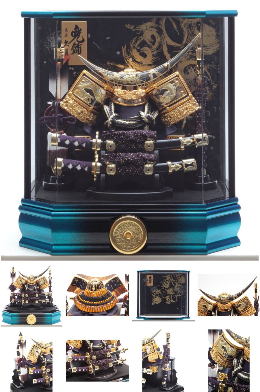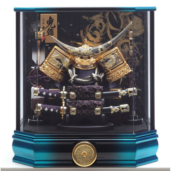 流線形の三日月前立ての兜です。青色に黒ぼかしを施したケース枠が特徴的な兜飾りです。背景のデザインは金色に輝く渦をイメージしました。