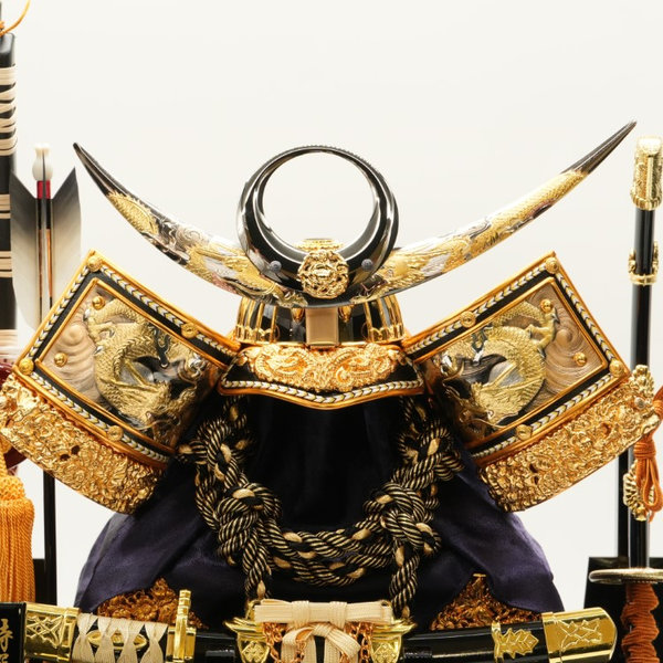 月と太陽を表す「日月前立て」と、古来は矢を防ぐ役割のあった吹き返しにそれぞれ向かい合う龍の図を施した豪華な兜です。様々な竜の意匠が運を呼び、魔を払うような兜飾りです。