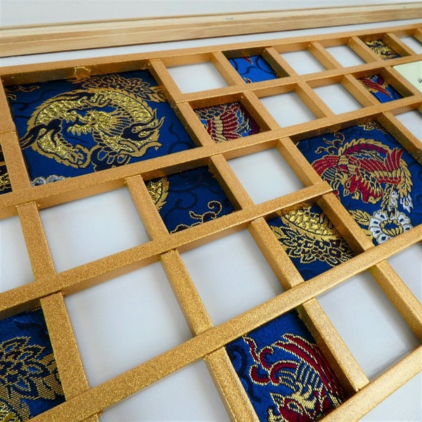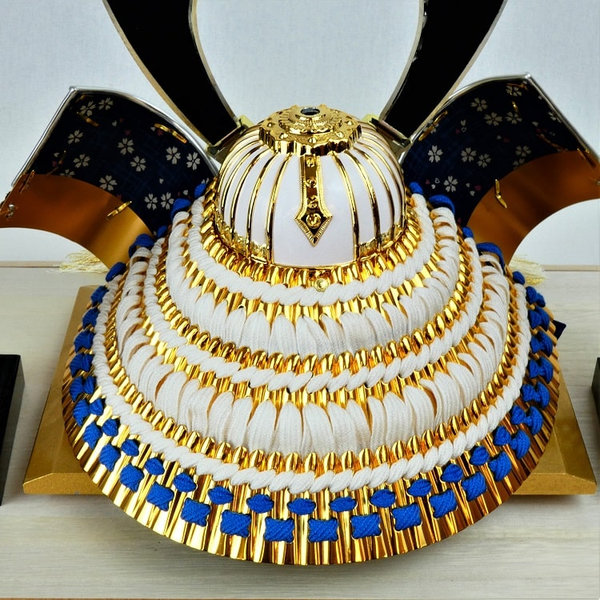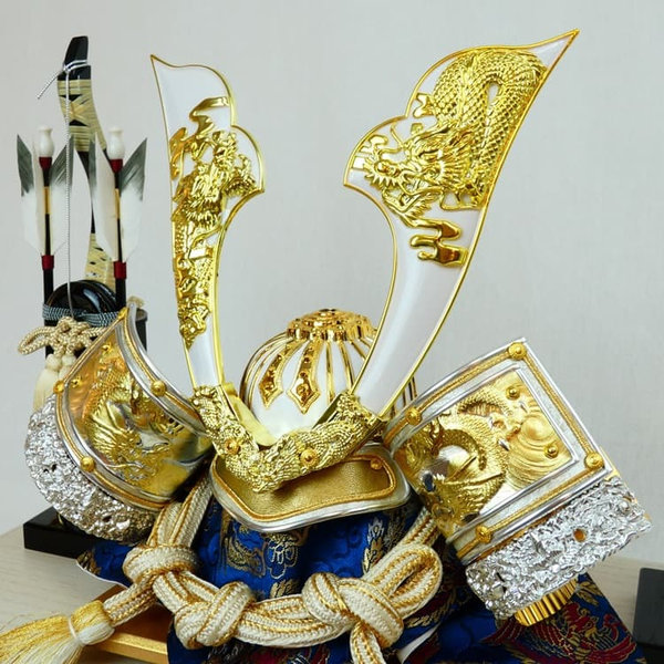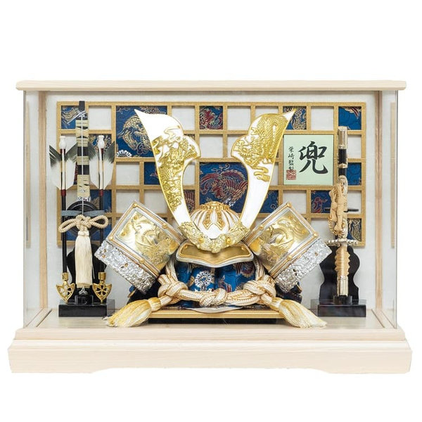 白を基調とした兜には黄金の龍が力強く舞い、背景の格子と袱紗(ふくさ)には龍柄の西陣織を施しました。木目を活かした温かみのあるアクリル製ケース飾りです。