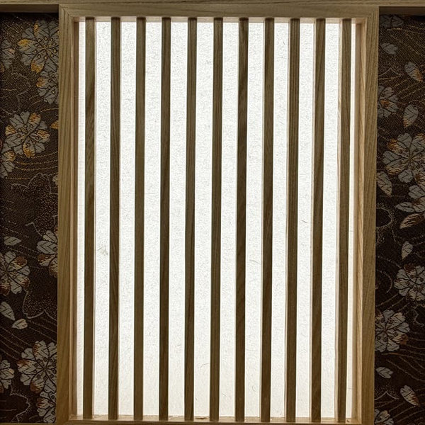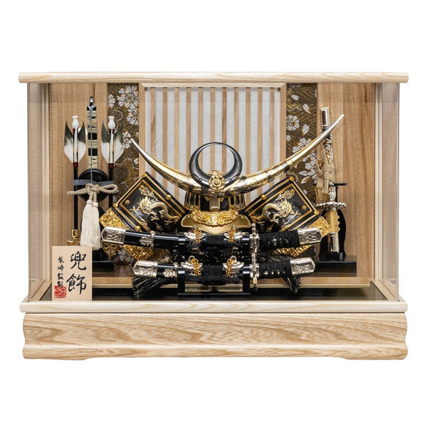ケース枠の木目も美しく、背景に施した明かりを通す岐阜県産の手漉き和紙が兜を引き立てています。