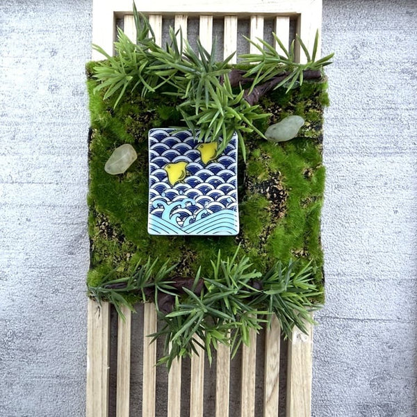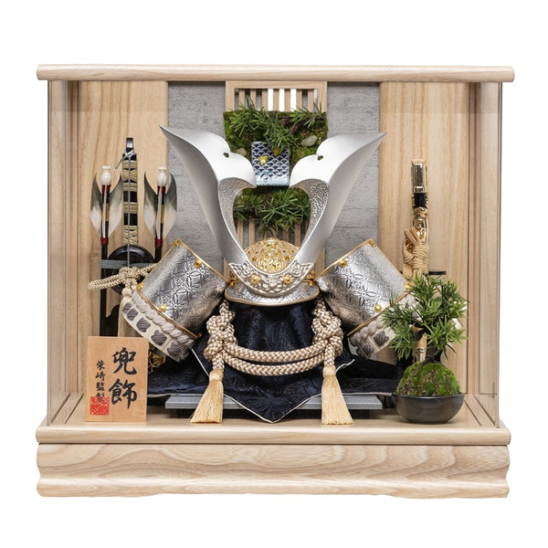 大地の鼓動を感じる緑の演出に、九谷焼のアクセントが加わり、兜飾りを色鮮やかに引き立てます。