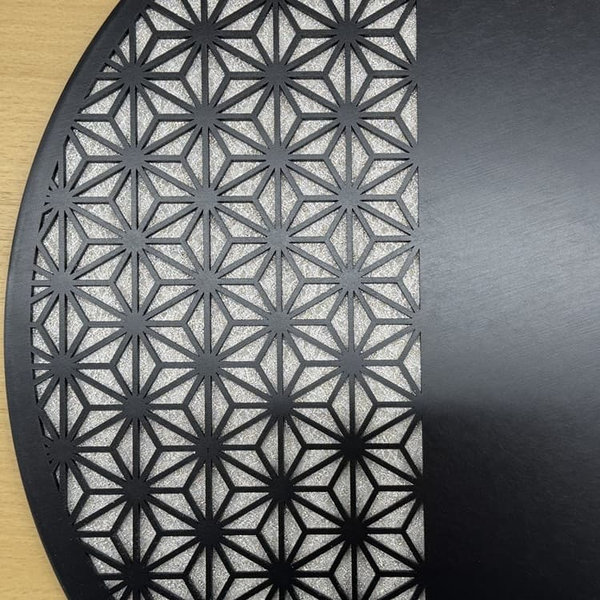 永遠の繁栄を願う麻の葉文様が背景に透かし細工で描かれ、漆黒色で全体がコーディネートされたスタイリッシュな円型アクリルケース飾りです。
