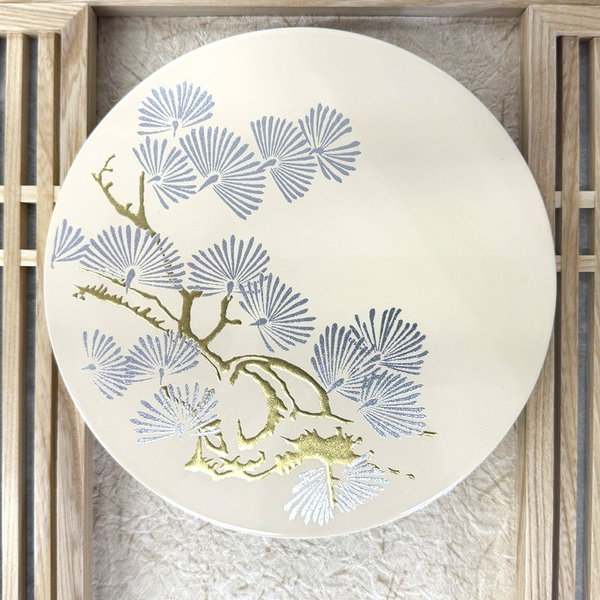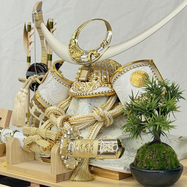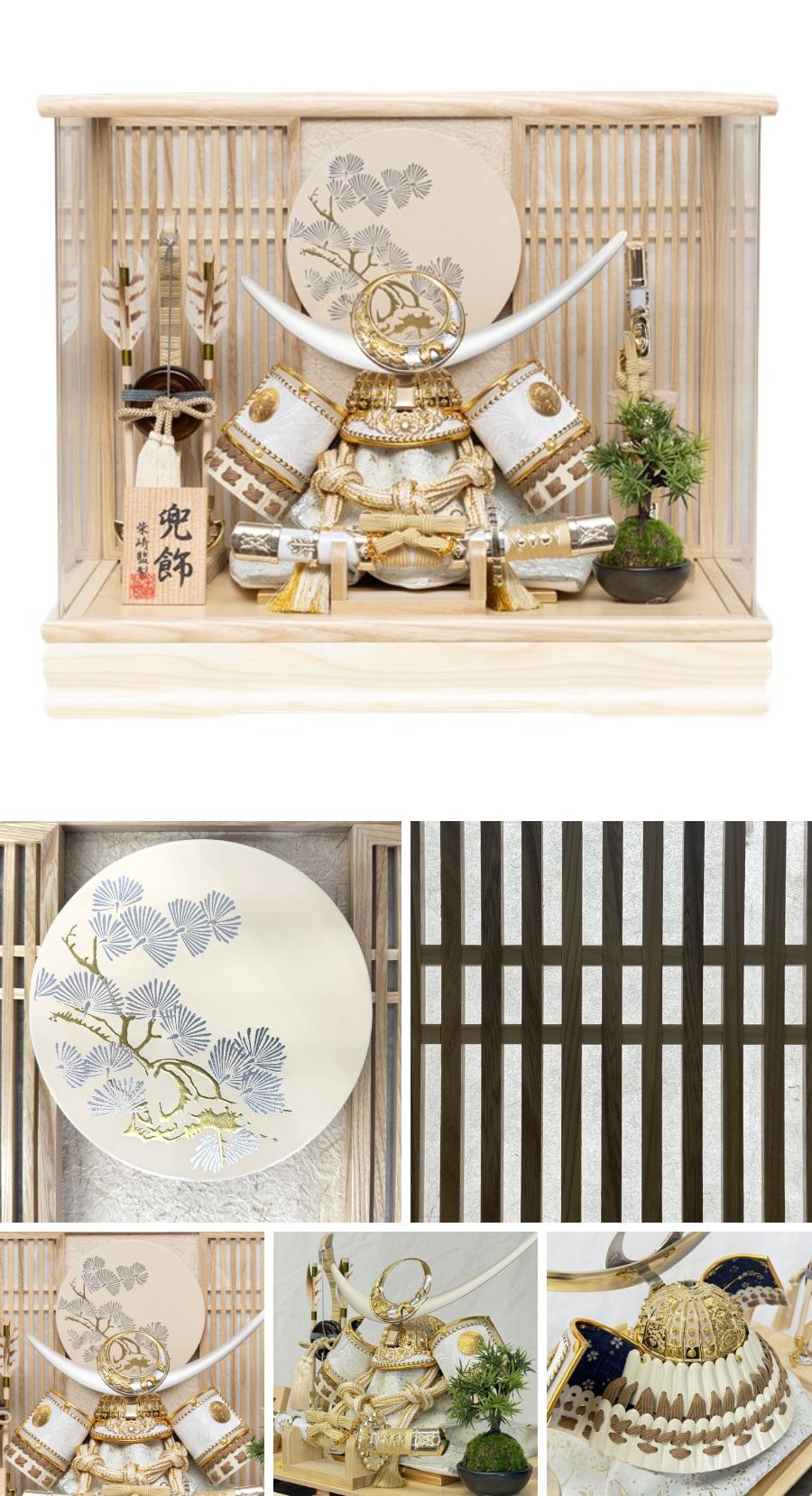 加賀蒔絵で描かれた背景の松や、岐阜県産の手漉き和紙格子細工が、日輪三日月の兜を格調高く引き立てます。