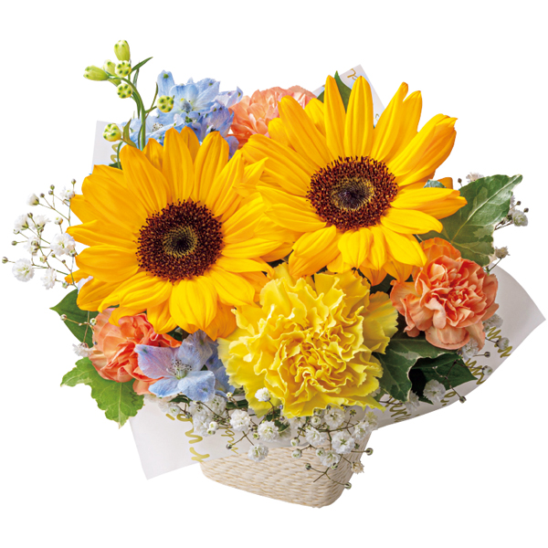 ひまわりの黄色にブルーのお花がアクセント。カラフルで爽やかな色合いが人気です。