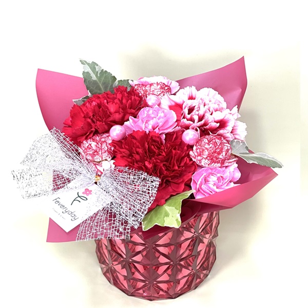 大輪カーネーション3本、スプレーカーネーション、アイビー、プラスチック花器