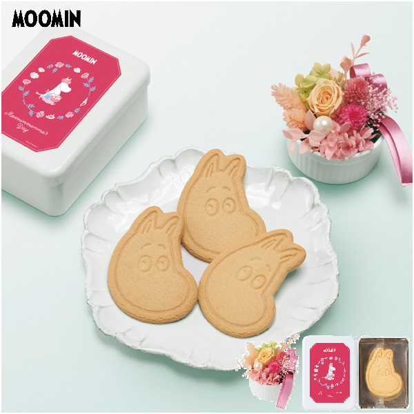 ムーミンのダイカットクッキーを詰合せた缶とプリザーブドフラワーのセット。ムーミンママが描かれた母の日限定デザインの缶は、食べ終わった後は小物入れとしてお使いいただけます。