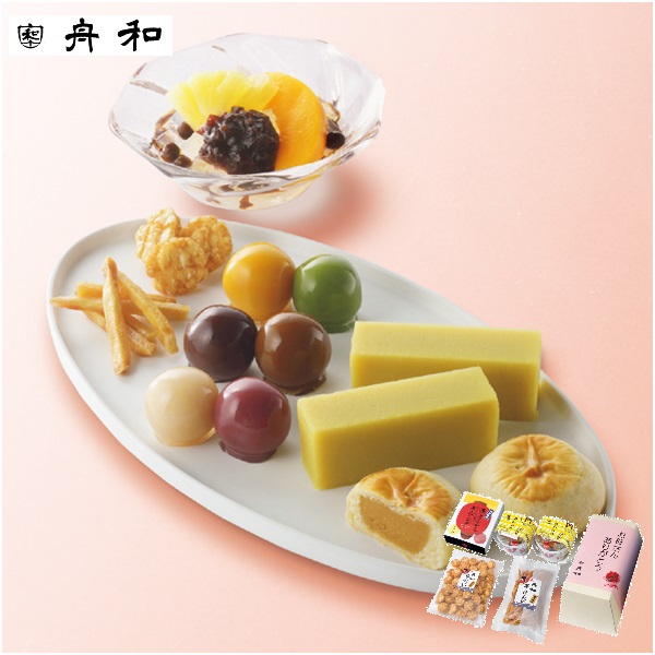 詰合せ8個入(芋ようかん2、あんこ玉6)、小倉あんみつ2、お芋パイ4、舟和芋けんぴ、舟和せんべい(小菊揚げ)
