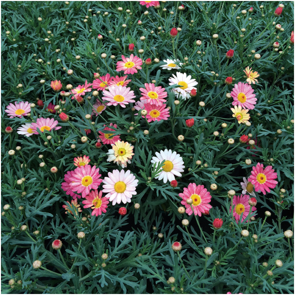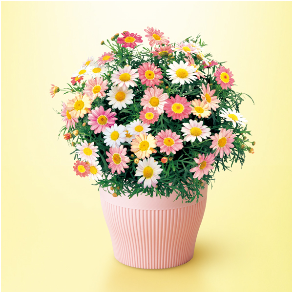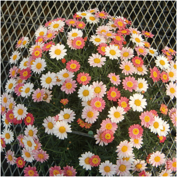 気候によって花色が変化するマーガレット。1株でドーム状に花開く多色咲きです。