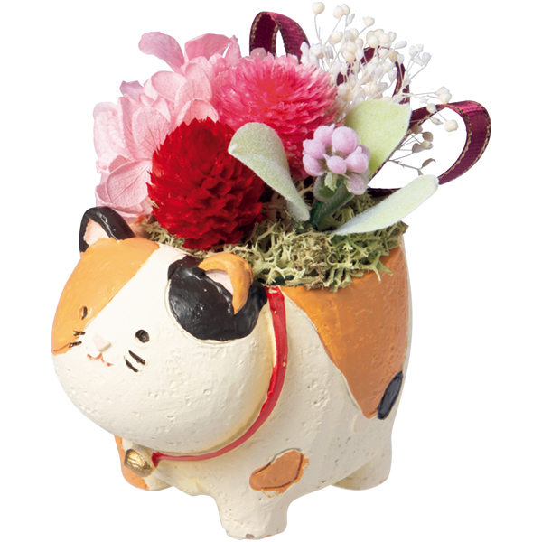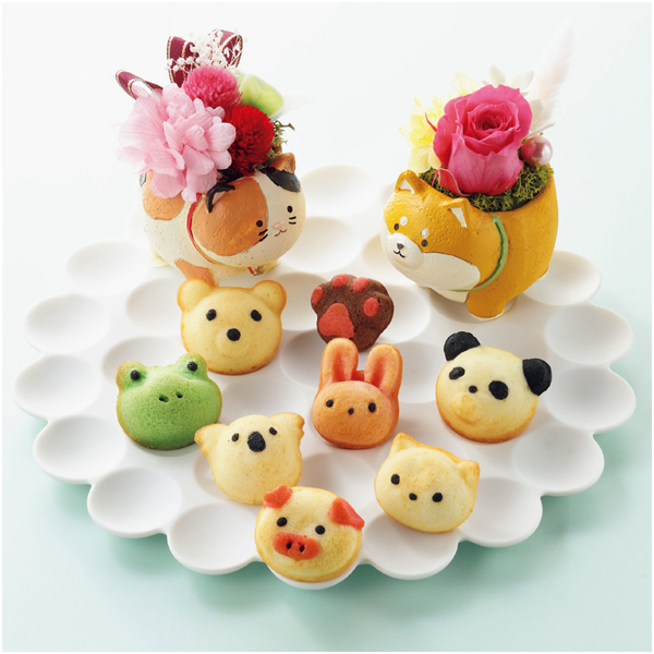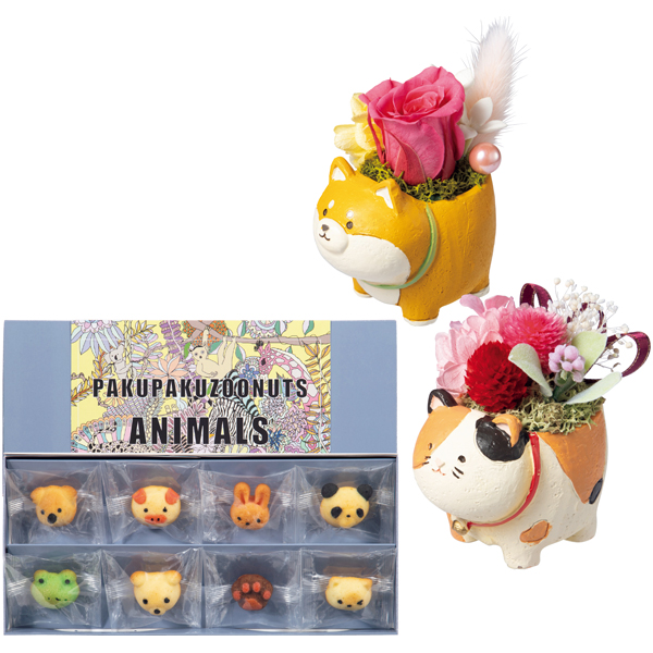 アニマルドーナツ8、プリザーブドフラワー(いぬ(バラ、アジサイ)、造花、樹脂製器、ねこ(千日紅、アジサイ、カスミソウ)、造花、樹脂製器:各幅約5.5×高さ約8cm)