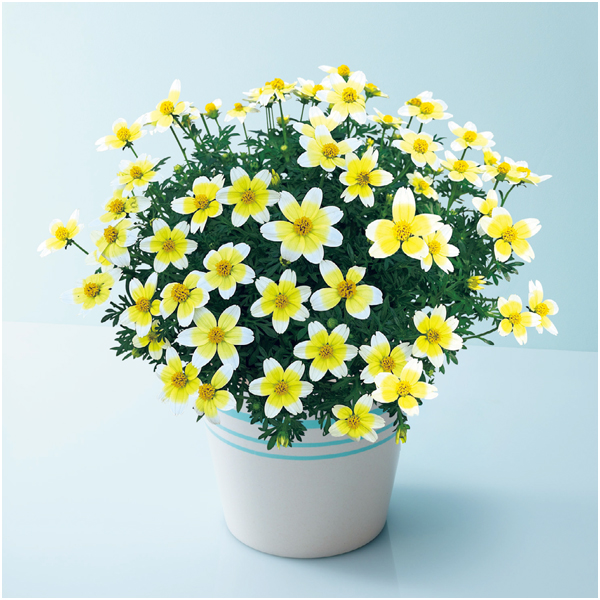 透明感のあるレモンイエローとホワイトの花びらがかわいらしい一鉢です。