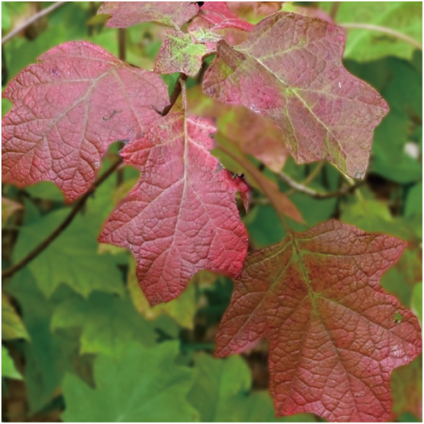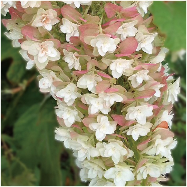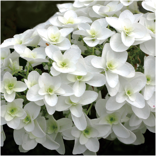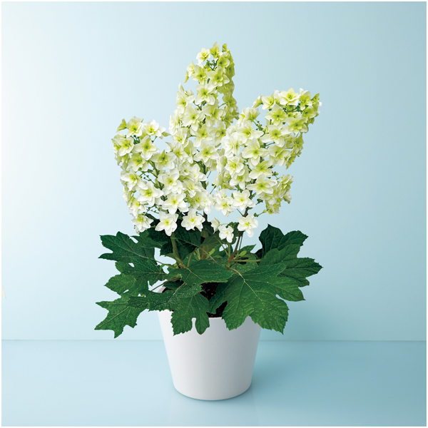 庭植えでも人気の八重咲きのかしわばあじさい。ライムがかった白い筒状の花穂を伸ばし、秋には美しい紅葉も楽しめます。