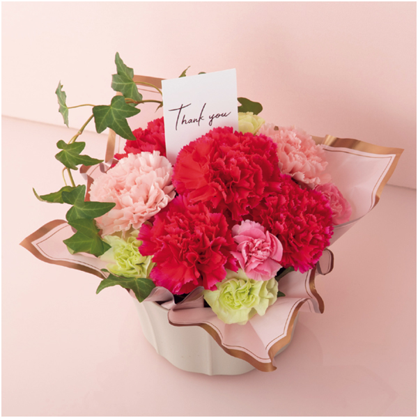 カーネーション(ピンク系6)、スプレーカーネーション(ピンク系、グリーン系)、グリーン、母の日ピック、プラスティック花器、高さ約15×幅約14cm
