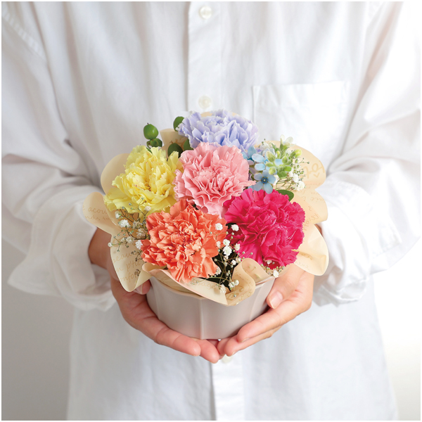 染めカーネーション(紫系)、カーネーション(濃ピンク、ピンク、イエロー、オレンジ系)、ヒペリカム、ブルースター、カスミソウ、プラスティック花器、高さ約16cm×幅約14cm