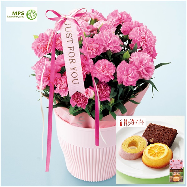 アサミグリーンプランツ カーネーション「ホットハート」(SUSTEE付)+神戸スイーツポート 母の日焼き菓子セット