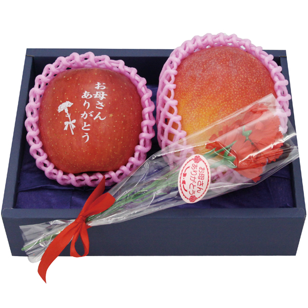 青森県産文字入りりんご1個(240g以上)、宮崎県産マンゴー1個(300g以上)、カーネーション1本(造花)