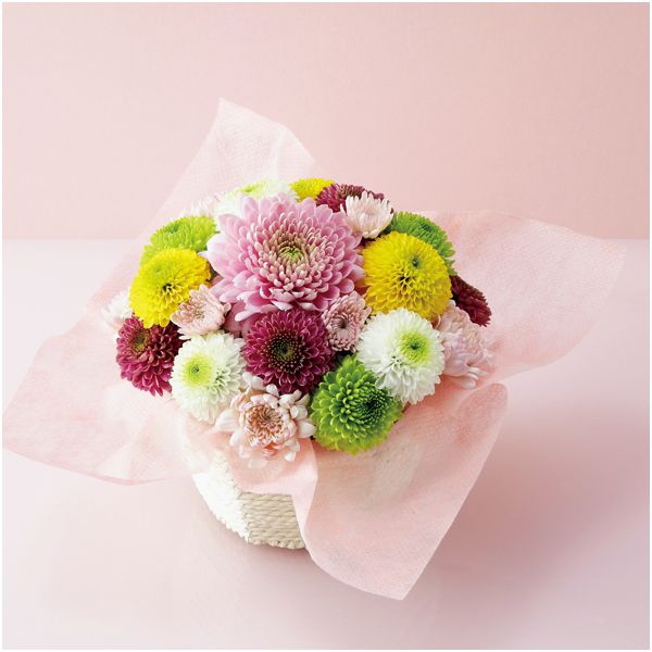 色とりどりのマムを使ってラブリーなアレンジをつくりました。マカロンケーキのようなフォルムにお母さんもニッコリ!