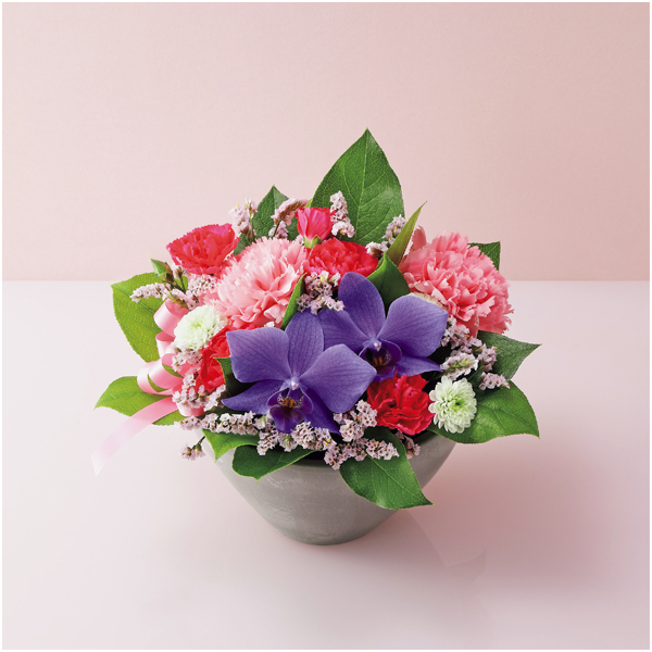 長年多くの育種家が試みたものの成し得なかった青色胡蝶蘭。「奇跡のめぐり逢い」というその花言葉が表すように、世界で初めて天然の青色を叶えた青色の蘭を使ったアレンジメントです。母の日定番のカーネーションや愛らしい花々との上品なコレボレーションです。