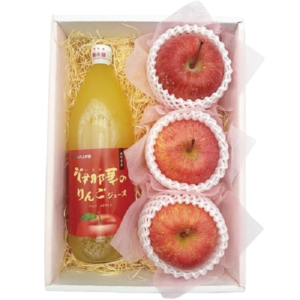 ふじりんご3個(1個300g以上)、りんごジュース(ストレート)1本(1000ml)