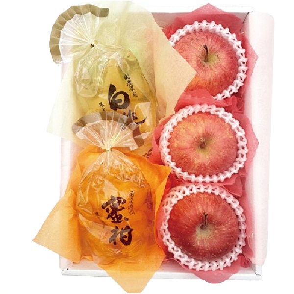 青森県産ふじりんご3個(1個300g以上)、みかんゼリー1袋(400g)、白桃ゼリー1袋(400g)