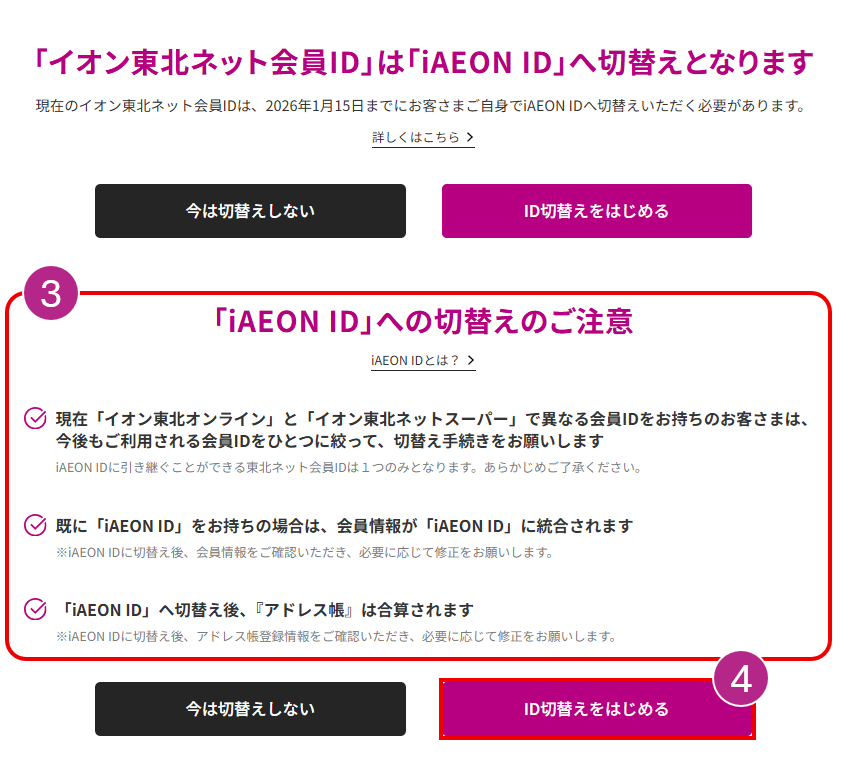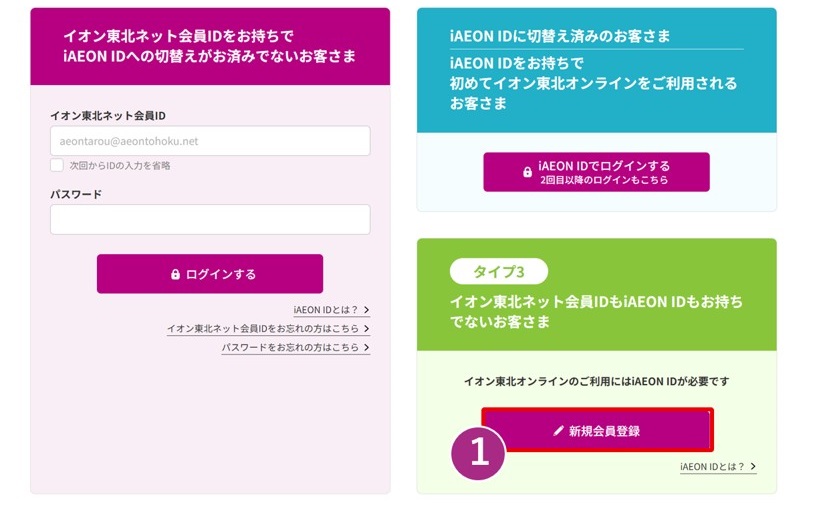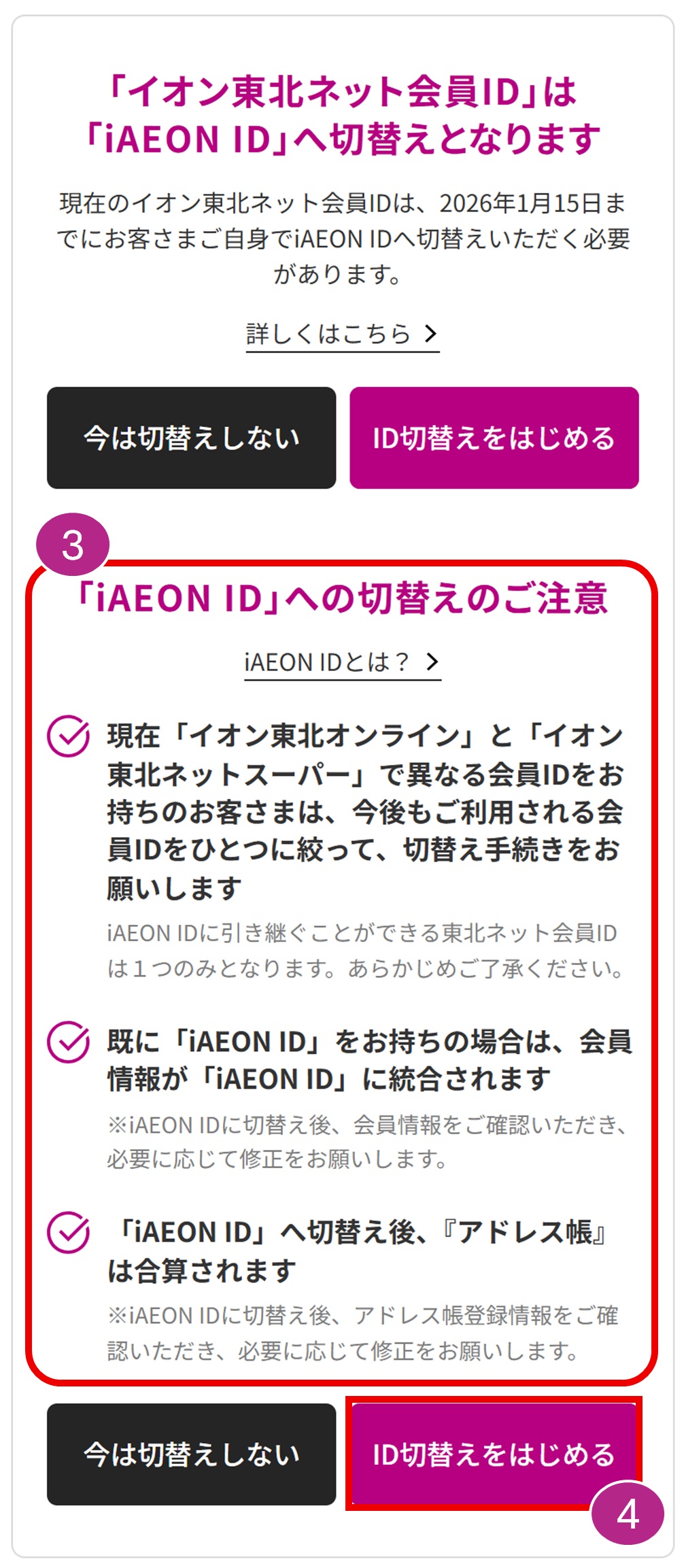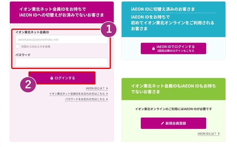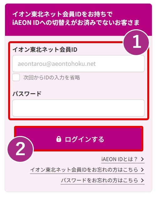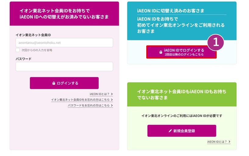 - ① イオン東北ネット会員IDをお持ちでiAEON IDへの切替えがお済みでないお客さま