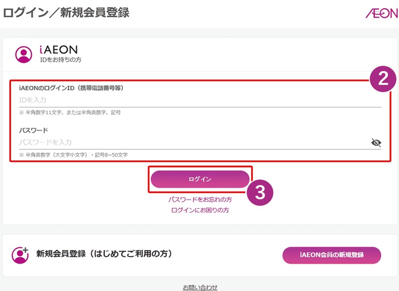 2ご登録済のiAEONのログインID、パスワードを入力します。