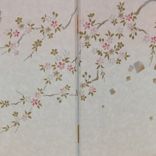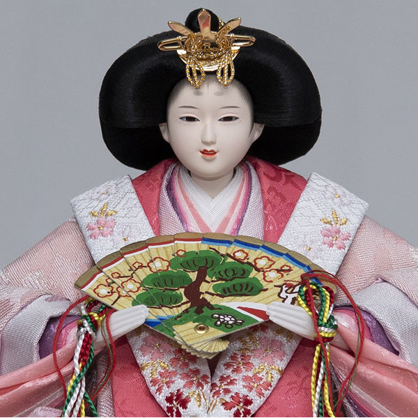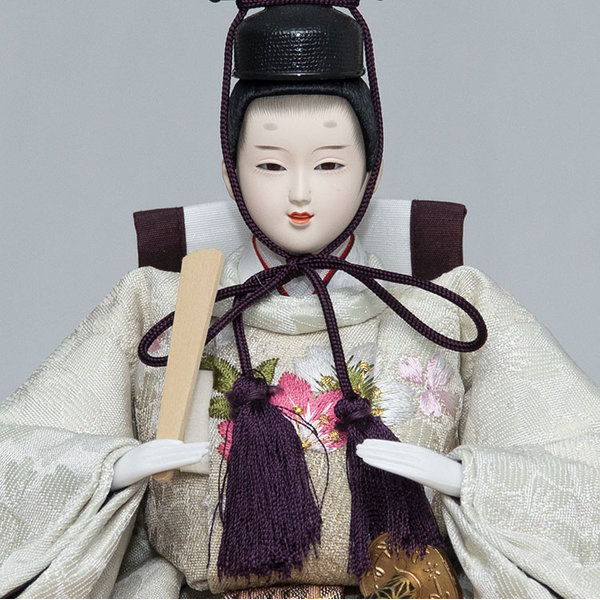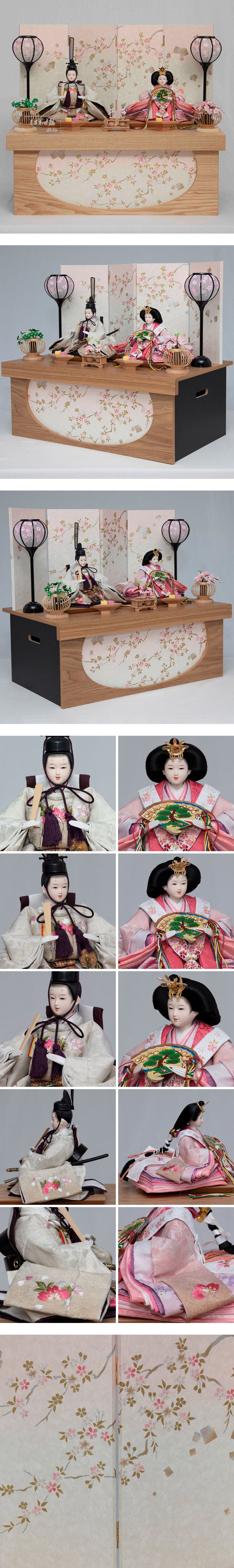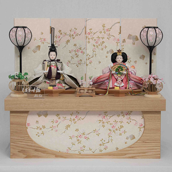 お人形の衣裳には桜の刺繍を配し、屏風・幕板には桜の金彩を施し上品な印象に仕上げました。木目を活かした温もりのある飾り台です。