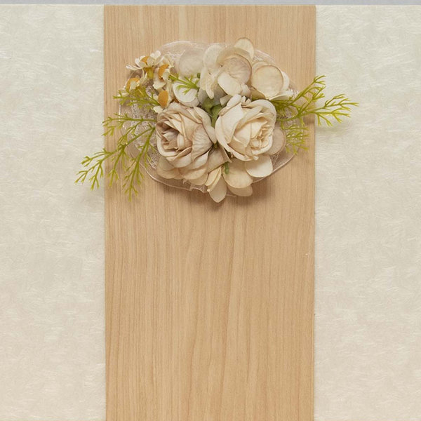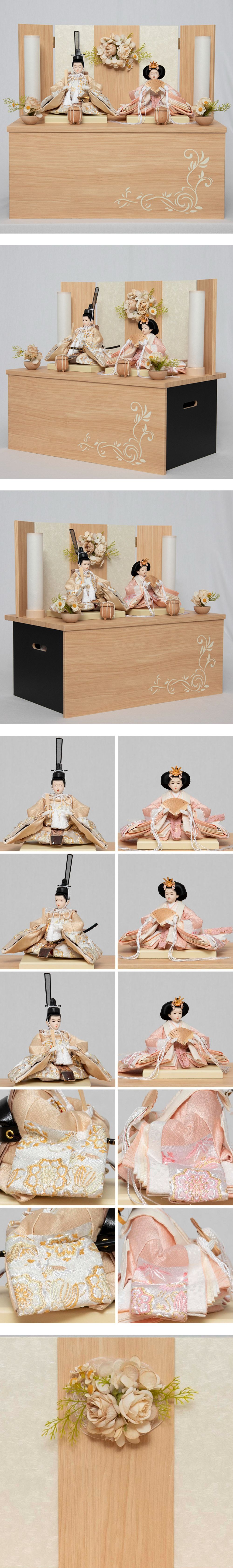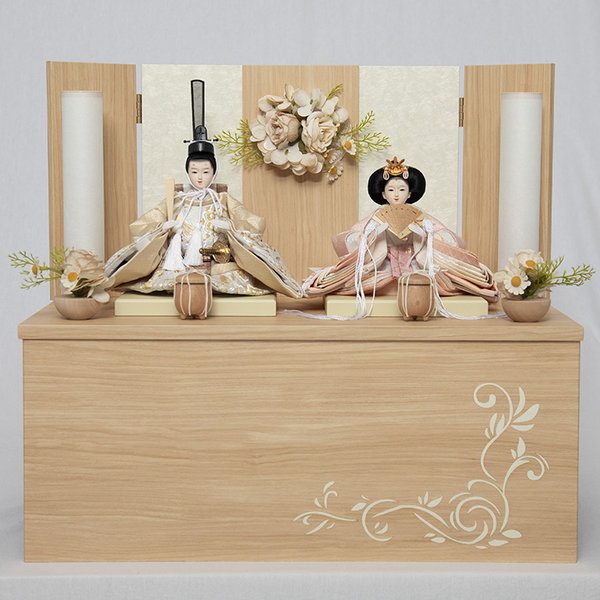 木目と白を基調にした台屏風ナチュラルカラーのお人形を配した。モダンな収納飾りです。屏風と前飾りに配した、アートフラワーが特徴です。