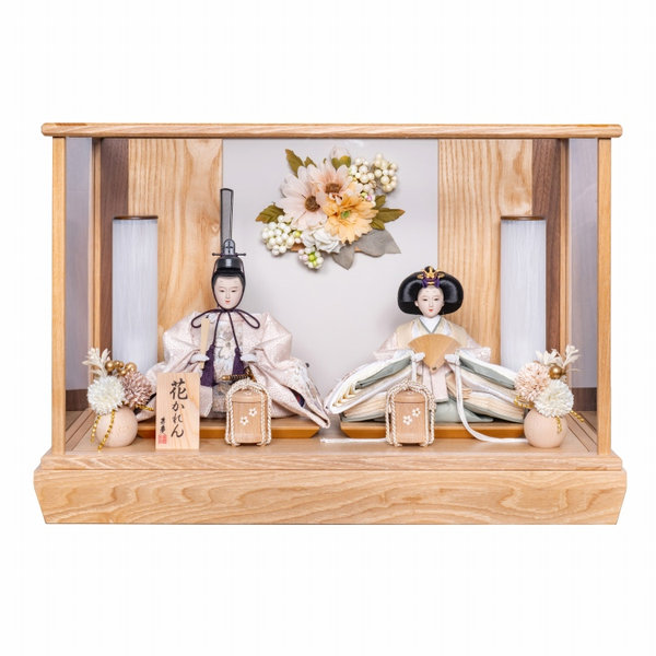 桜柄を刺繍で施した衣裳をまとったお人形に、背景は花飾りを使用した木目を活かしたお飾りです