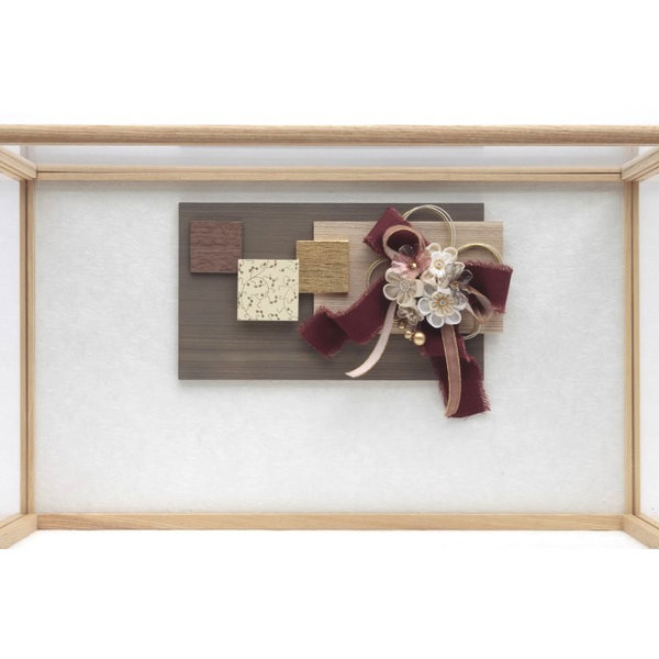 背景にリボンと「つまみ細工」を配した木目調のケース飾りです。