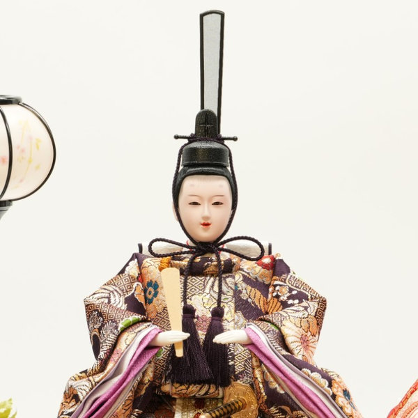 「熨斗に桜」模様の背景に伝統的な色合いの衣裳のお人形を合わせました。