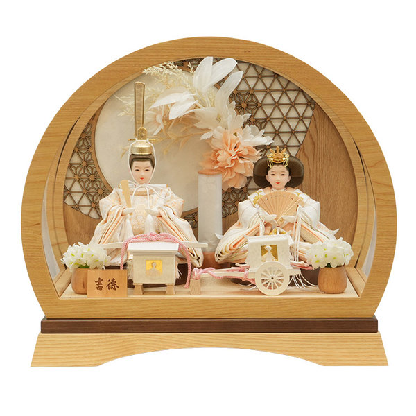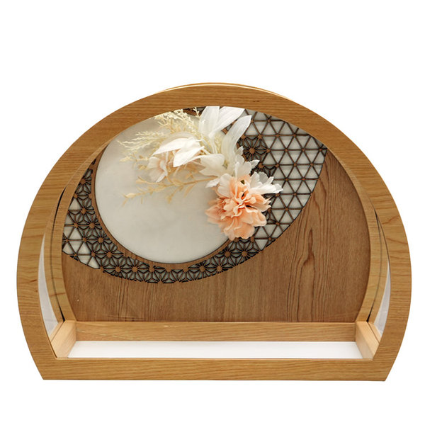 木目を活かした丸型のケースにはアレンジメントフラワーを配し、お人形の毛髪を茶色に染毛してモダンテイストに仕上げました。