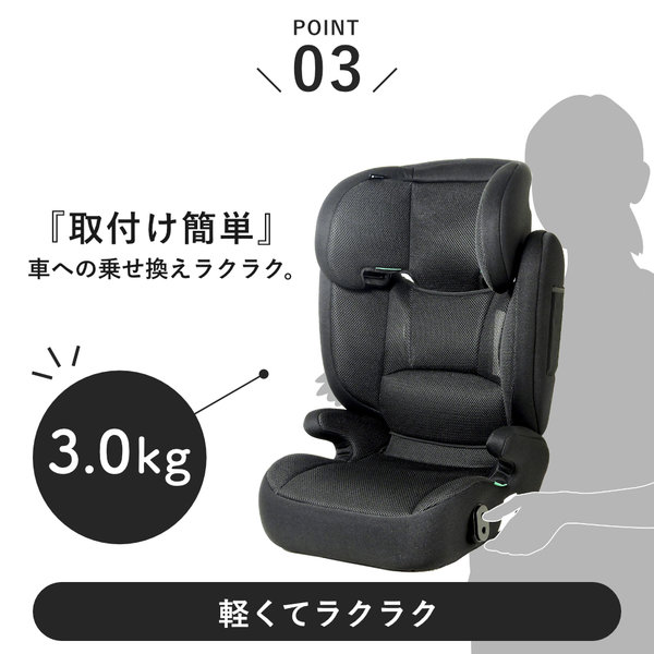 軽量の3kgで持ち運び便利な「ハイバックジュニアライト R129」。新安全規則R129に適合し、お子さまをしっかり守ります。
