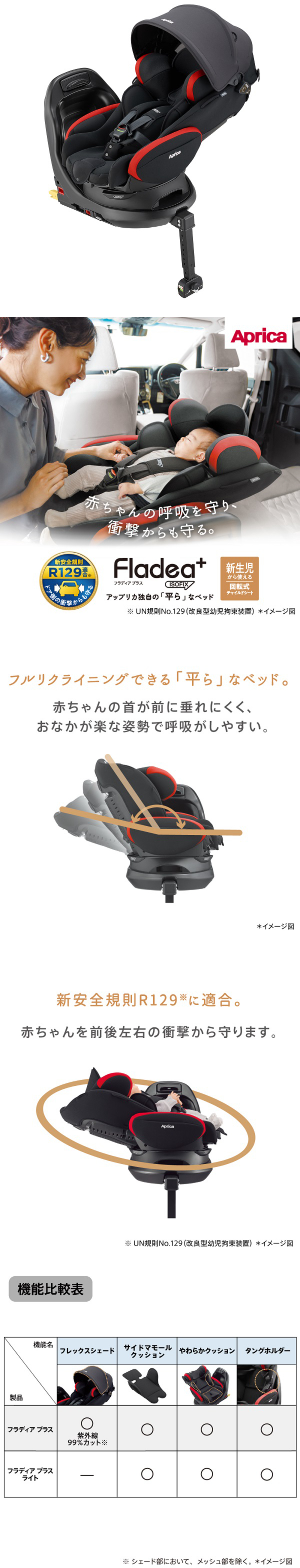 アップリカ独自の「平らな」ベッドのチャイルドシートは赤ちゃんの首が前に垂れにくく、おなかが楽な姿勢で呼吸がしやすいから安心。