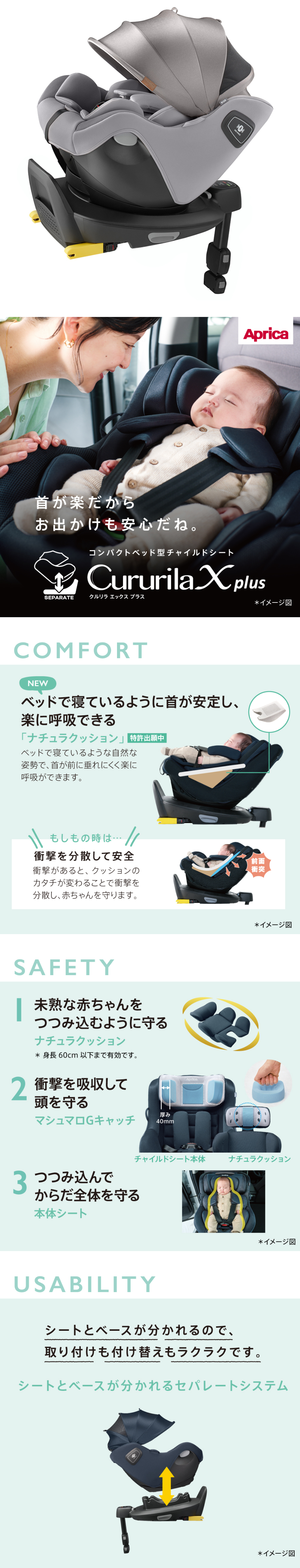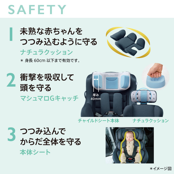 赤ちゃんの快適性、衝撃から守る安全性、日々の使いやすさに優れたチャイルドシート。