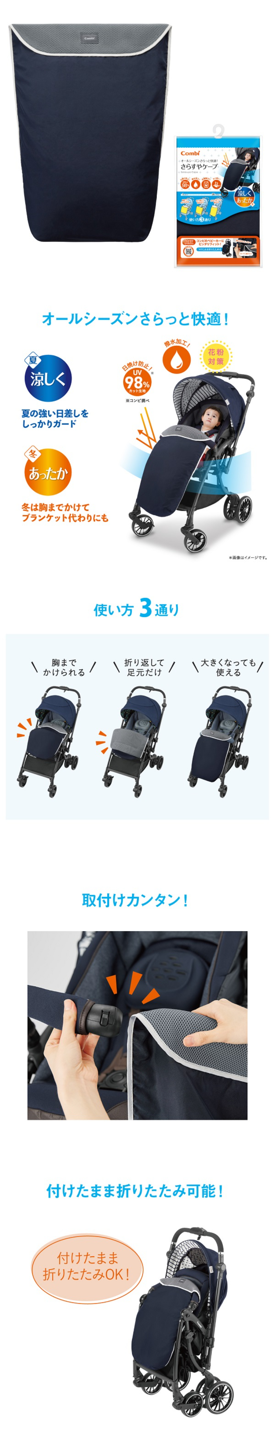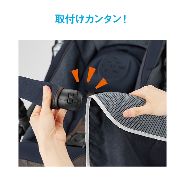 コンビのベビーカーにフィットした設計なので、付けたままベビーカーの折りたたみが可能。