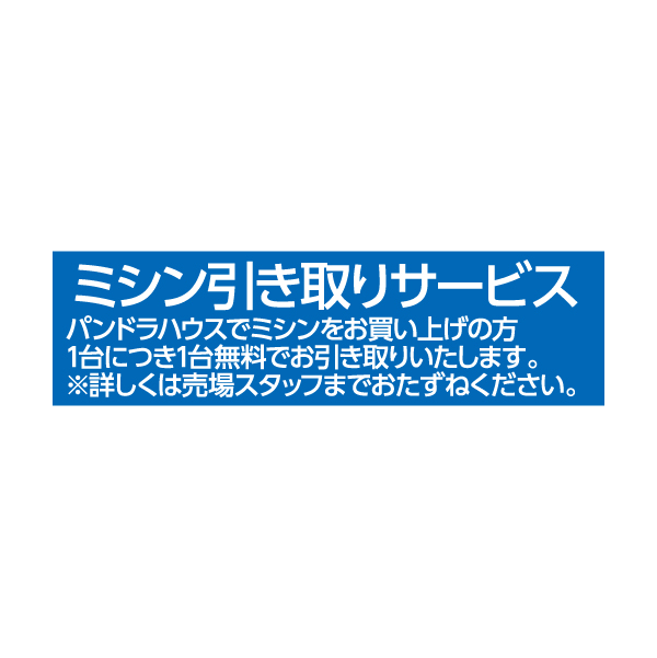 ●ミシン引き取りサービス:パンドラハウスでミシンをお買い上げの方1台につき1台無料でお引き取りいたします。