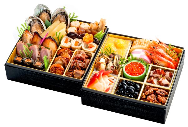 活あわびの柔らか煮、寿数の子、穂付筍白だし煮、たたき牛蒡、ねじり蒟蒻オランダ煮、椎茸旨煮、きぬさや、六方里芋のだし煮、ねじり梅人参、信田巻き、銀だらの吟醸酒粕漬焼き、紅白はじかみ、あい鴨ロースのパストラミ、たらこの小袖昆布巻き、帆立の照り焼き、仙台名物牛たんの角煮