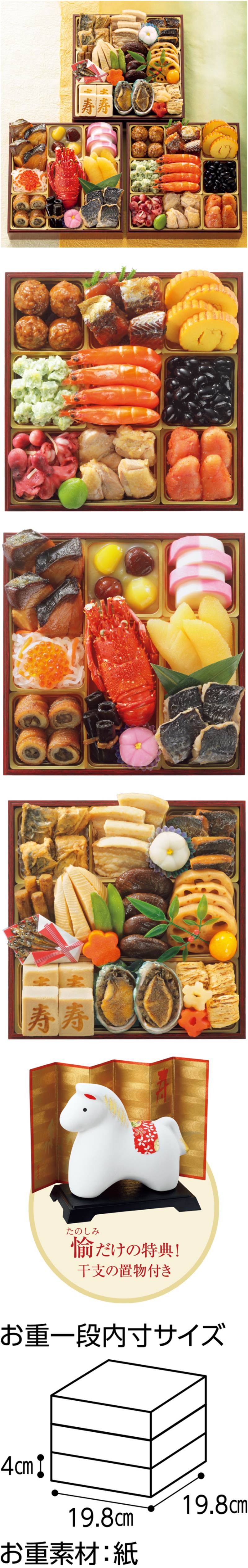 ぶり照焼、紅はるかきんとん、栗甘露煮、渋皮栗甘露煮、紅白かまぼこ、紅白なます、いくら醤油漬、ボイルロブスター、一口昆布巻、味付数の子、花餅(紅梅)、さわら幽庵焼、穴子八幡巻