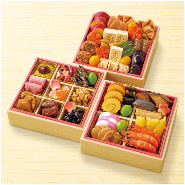 きんとん、渋皮栗甘露煮、酢だこ、減塩田作り、若桃甘露煮、ローストビーフ、梅麩、紅白なます、鱒いくら醤油漬、くるみ煮、減塩帆立煮、減塩鱈の旨煮、黒豆煮