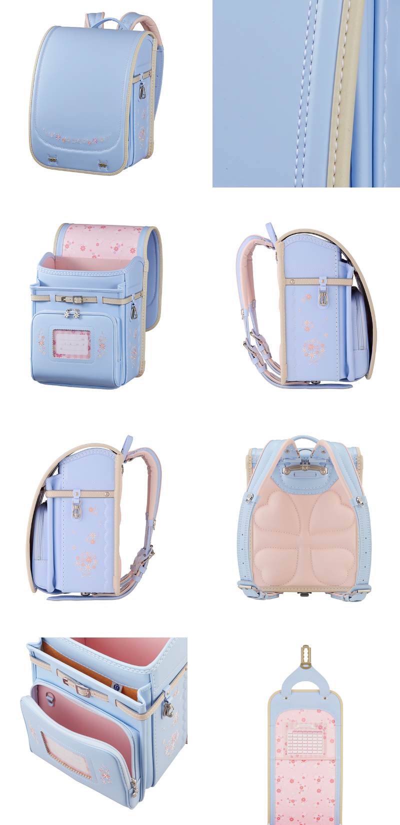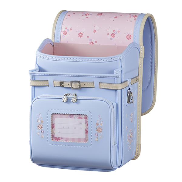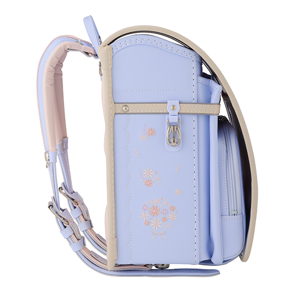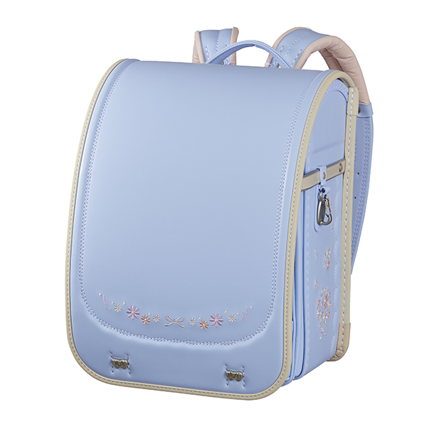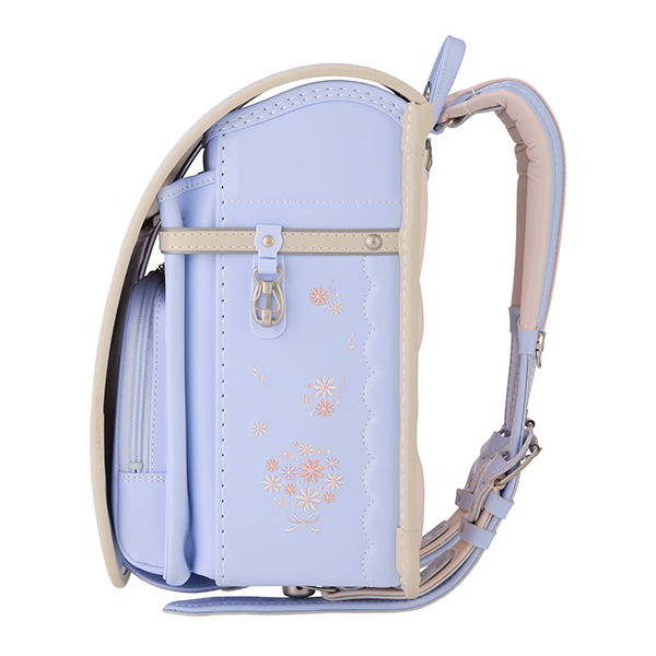 可愛いお花のブーケをイメージした刺繍を各所に配置。気取りすぎないナチュラルなデザインとなっています。前ポケットの引き手にワンポイントでラインストーンを採用しています。また、背中のクッションには4つのハートをあしらい、デザインと通気性を兼ね備えたデザインとなっています。