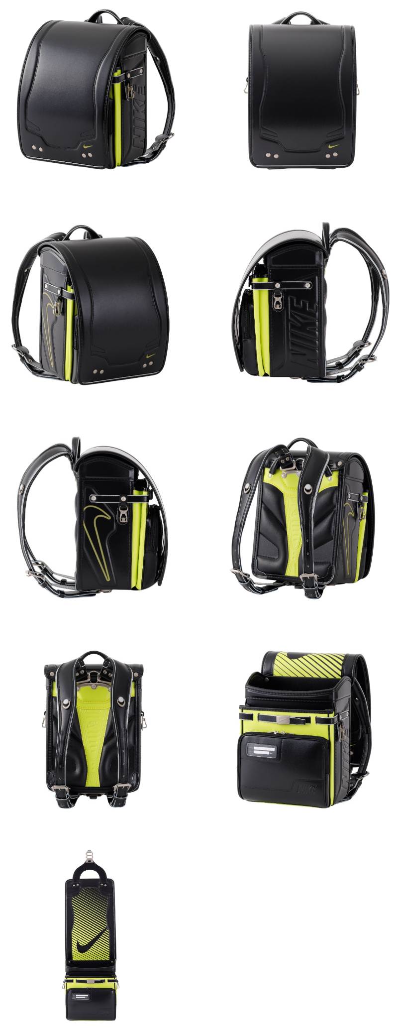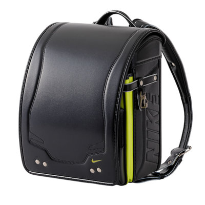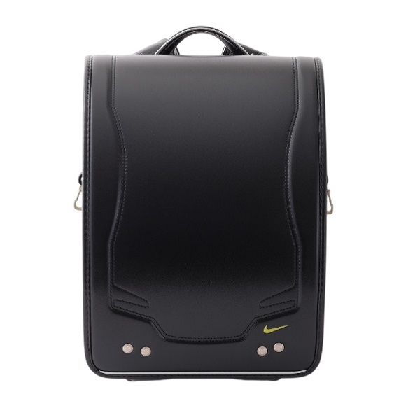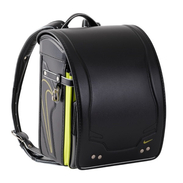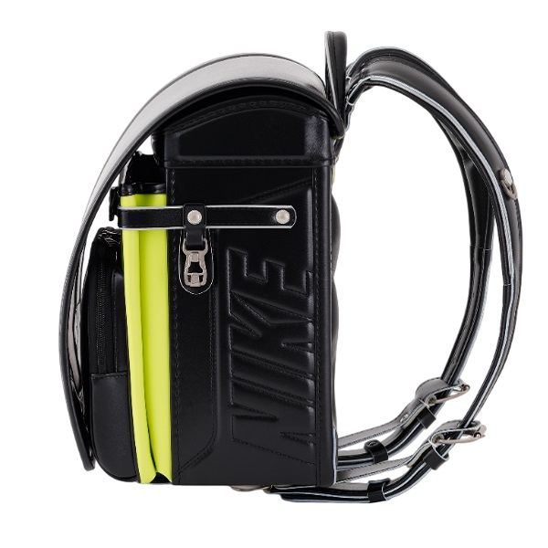 各所にナイキの表現が入った、スポーツテイストのランドセルです。オオマチとカブセのロゴマークは反射材になっております。また、金属部材にはナイキのロゴを刻印しています。